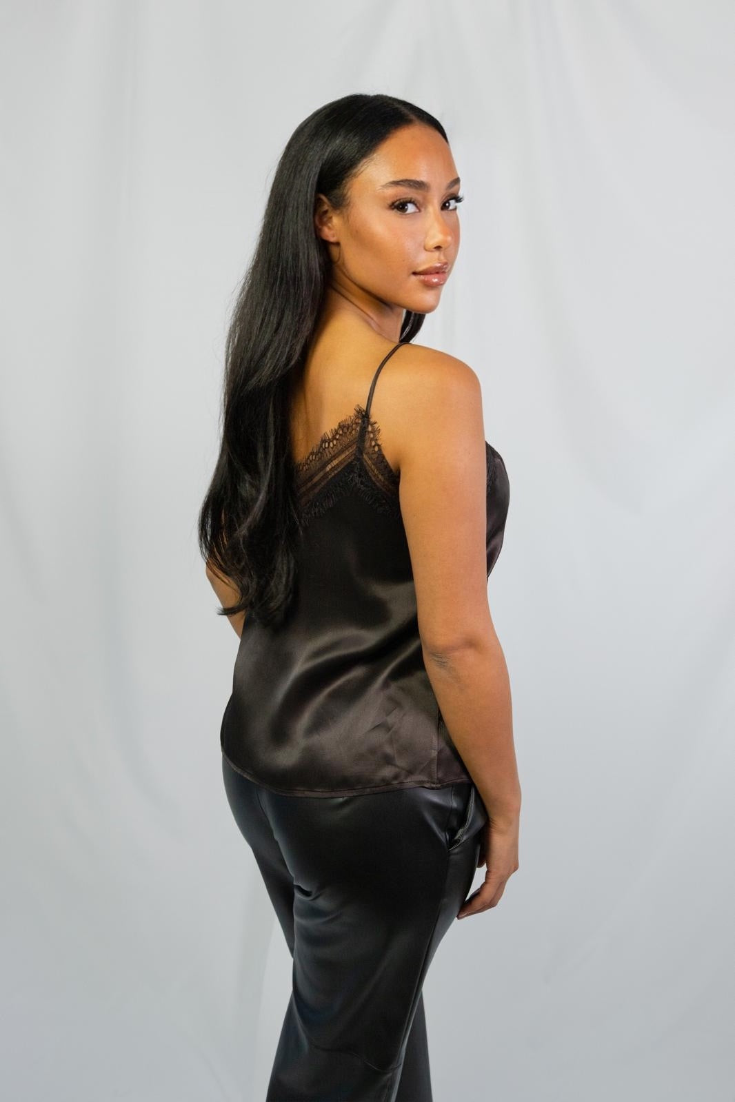 Feminine, sleek and endlessly versatile. This satin camisole features delicate lace trim along the neckline and back, with thin adjustable straps for a flattering fit. The soft satin fabric drapes beautifully, making it perfect to wear solo for a night out or layered under a blazer for an elegant touch.