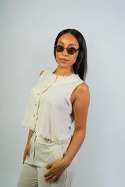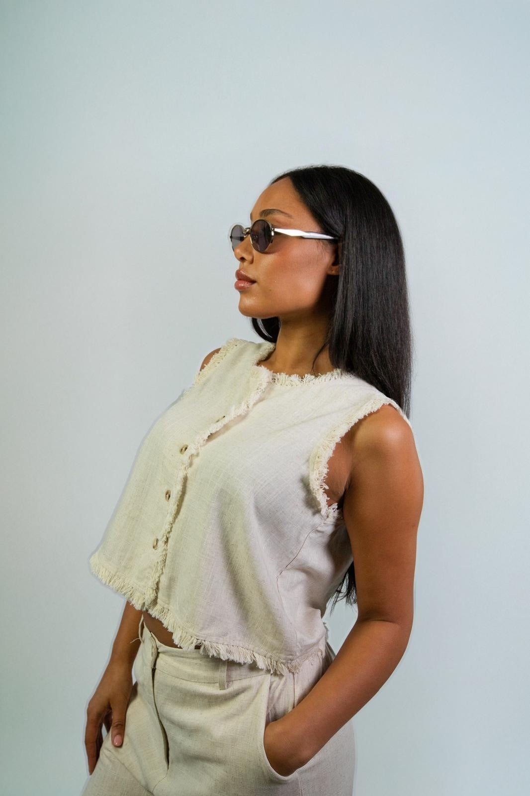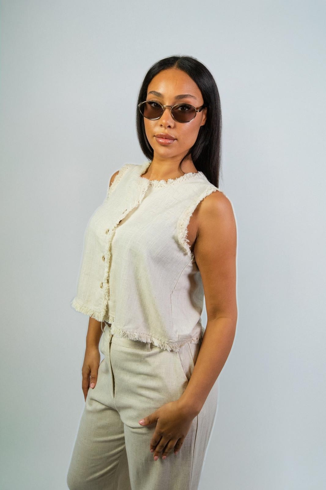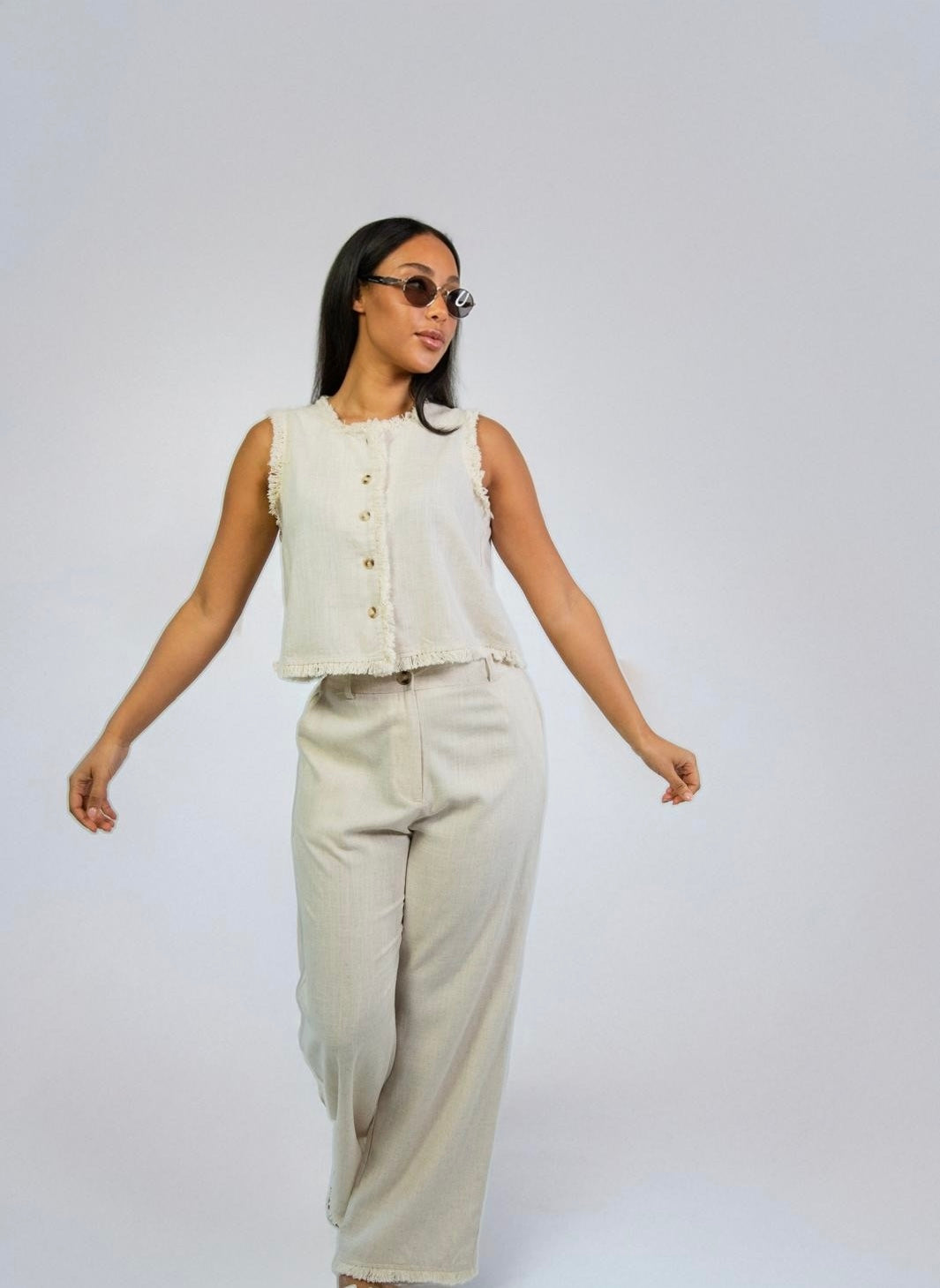 Effortlessly chic and endlessly versatile. This co-ord set features a sleeveless button-up top with frayed edges and a relaxed fit, paired with high-waisted wide-leg trousers for a laidback yet polished silhouette. Crafted from a light linen blend in a soft neutral shade, it’s the perfect summer set that can be styled together or worn separately.